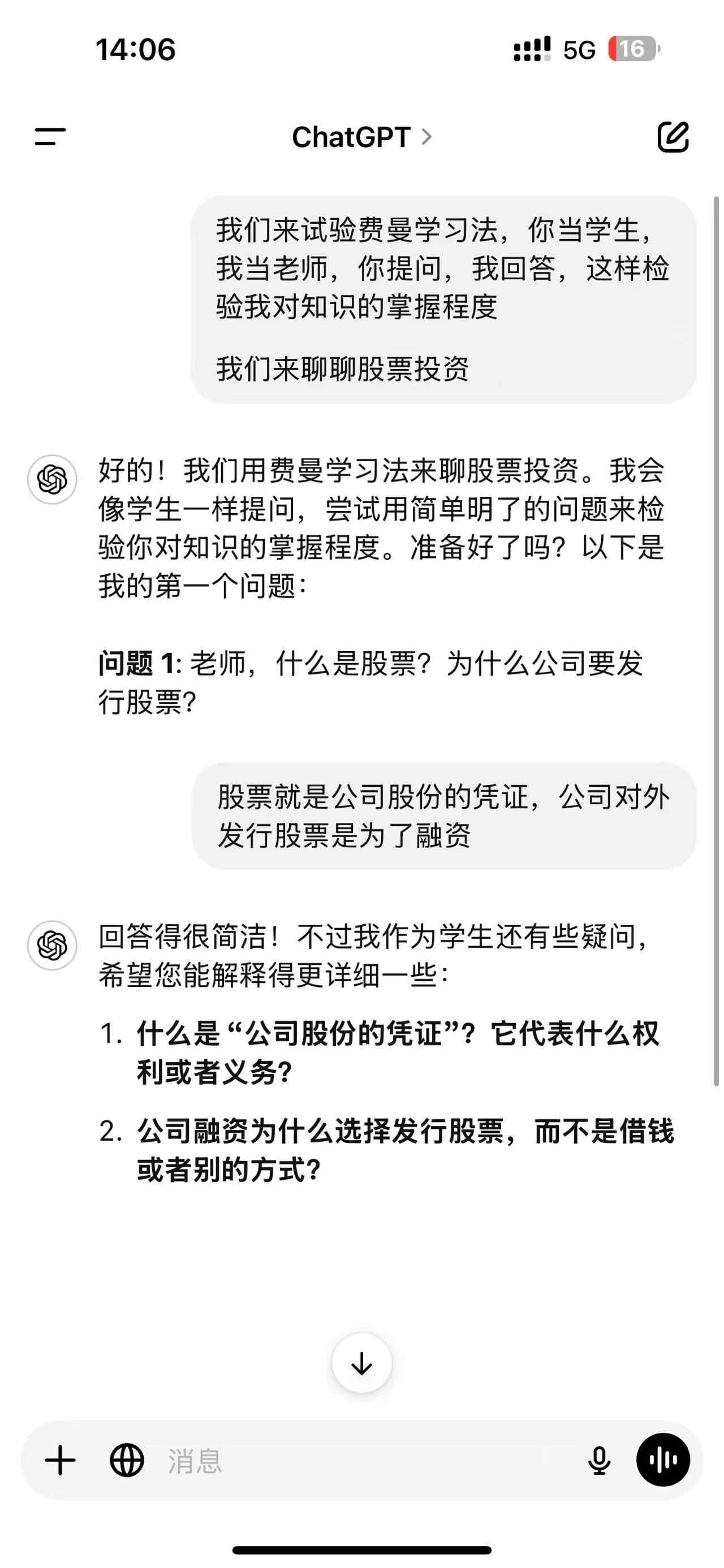 看有人分享了个GPT用法:“看到一个用AI自学方法:网上找视频教程,用通义听悟转文字,结合其他基础资料喂给ChatGPT ,叫ChatGPT 开始给自己讲课。” 我觉得这法子还不够好,更好的方法是你自己当老师,让ChatGPT当一个聪明又爱提问的学生,答不上来的时候另开一个会话去找ChatGPT咨询,保管你学习效果翻倍!